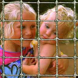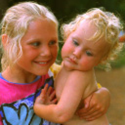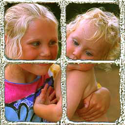 Let's look at a typical scene: a blonde girl -- my daughter Martien -- wearing a magenta and blue T-shirt, holding a blonde baby boy -- her cousin Pieter. Behind the pair is dark green woodland and sandy ground.