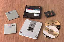 Back row, left to right: High Density 3.5 inch floppy diskette (1.4MB), SyQuest 44MB, DAT tape (2GB).