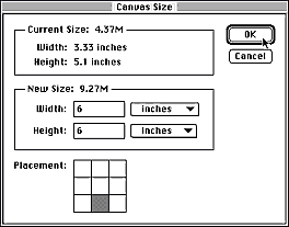 First select Image>Canvas Size from the Menu Bar. Up comes a dialogue box which gives the Current image Size (3.33x5.1 inches) and asks for the New Size required. In this case I guessed a size large enough to accommodate my intended adjustments: 6x6 inches. At the bottom of the dialogue box a noughts-and-crosses grid is labelled 'Placement'. Use this to indicate the placing of the image on the new canvas. In this case, select bottom centre and click OK. (To make thinks clearer on the printed page I chose to make the new canvas grey. By default it would be white.)