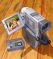 It also has a 25 fps motor drive which, of course, makes it a full-motion video camera. It also records stereo sound. Digital recording is on a tiny cassette of quarter inch DV (Digital Video) tape which records up to 63 minutes.