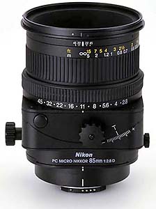 A new PC Micro-Nikkor 85mm f2.8 lens has built-in shift and tilt movements, making the camera suitable for applications such as architectural photography (correcting building verticals) and advertising photography (controlling plane of focus and distortion). The extra image field coverage needed by such lenses is helped by the fact that the CCD is somewhat smaller than a 35mm film frame.