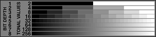 This chart shows all the gray tonal values which computers can display, together with how many computer bits are required to describe them. Notice that we term the number of bits used to describe each pixel of an image as the "bit depth".