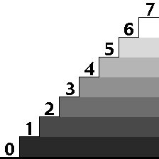 A staircase of seven steps gives us eight clearly defined levels between ground (level zero) and upper floor (the seventh step and, therefore, the eighth level). If applied to every point on an image, would eight steps be enough to represent a continuous tone image? Let's see what describing an image in eight tonal steps gives us.