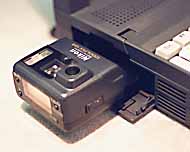 A cool solution from Nikon. The lens and CCD of the Coolpix 100 is mounted on a PC card which can hold 21 'high' quality images or 42 'normal' quality images - all with 512x480 pixels. No cables are required to connect the camera to the computer. Just plug the camera into the PC card slot.