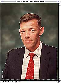 Select the Lasso tool (L), position the pointer, click and hold the mouse button, and start to draw a line around the subject's jacket, face and head. You will find this easier if you invested in a graphics tablet, though with a steady hand, you can do it with a mouse. Don't attempt to draw round the whole of the body in one go. Use the Zoom tool to describe a box around a small area of the image. That section immediately zooms up to fill the screen. With the image magnified it's much easier to make the selection accurately. Do just a bit at a time, circling round towards the start. When you release the button, the ends join up.