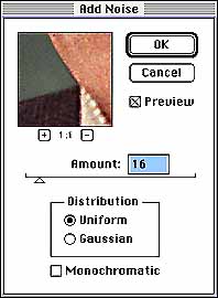 Now select Filter>Noise>Add Noise Move the pointer over the join between background and foreground of the image. Experiment with the settings for Uniform, Gaussian, Monochromatic and Amount until the noise you introduce into the background matches the grain in the foreground. I found an Amount of 16 Uniform to be right for this image. Click OK.
