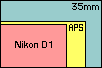 This diagram shows the comparative sizes of the Nikon D1's CCD (pink), a frame of APS film (yellow), and a frame of 35mm film (blue). (On a 72 pixel per inch monitor this will be displayed at actual size.) Note that the Nikon D1 frame area is close to that of APS but less than half the area of a frame of 35mm film.